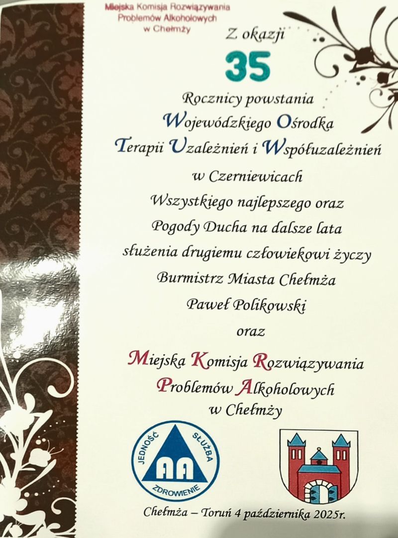 W dniu 4 października 2025r. Wojewódzki Ośrodek Terapii Uzależnień i Współuzależnień w Czerniewicach obchodził swoją 35 rocznicę powstania, którego jednym z założycieli był dr Krzysztof Liszcz. Z tej okazji do życzeń dołączył się również Burmistrz Miasta Chełmża p. Paweł Polikowski, a także Miejska Komisja Rozwiązywania Problemów Alkoholowych w Chełmży, która na co dzień współpracuje z oddziałem oraz wspiera jego działania. W obchodach oprócz absolwentów Akademii Czerniewickiej uczestniczyła również p. Katarzyna Liszcz żona zmarłego dr Liszcza, która odsłoniła pamiątkową tablicę. W uroczystości uczestniczyli przedstawiciele władz miasta Torunia oraz przedstawiciele służby zdrowia z oddziałów uzależnień, współuzależnień i detoksykacji, a także członek MKRPA w Chełmży Marian Walecki, który wręczył Kierowniczce oddziału Alicji Butkiewicz okazjonalny dyplom z życzeniami od Burmistrza i Komisji oraz drobny upominek.